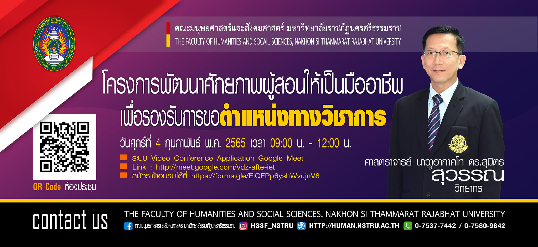 คณะมนุษยศาสตร์และสังคมศาสตร์ มหาวิทยาลัยราชภัฏนครศรีธรรมราช ขอเชิญคณาจารย์เข้าร่วมโครงการพัฒนาศักยภาพผู้สอนให้เป็นมืออาชีพ เพื่อรองรับการขอตำแหน่งทางวิชาการ วิทยากรโดย ศาสตราจารย์ นาวาอากาศโท ดร.สุมิตร สุวรรณ วันศุกร์ที่ 4 กุมภาพันธ์ พ.ศ. 2565 เวลา 09:00