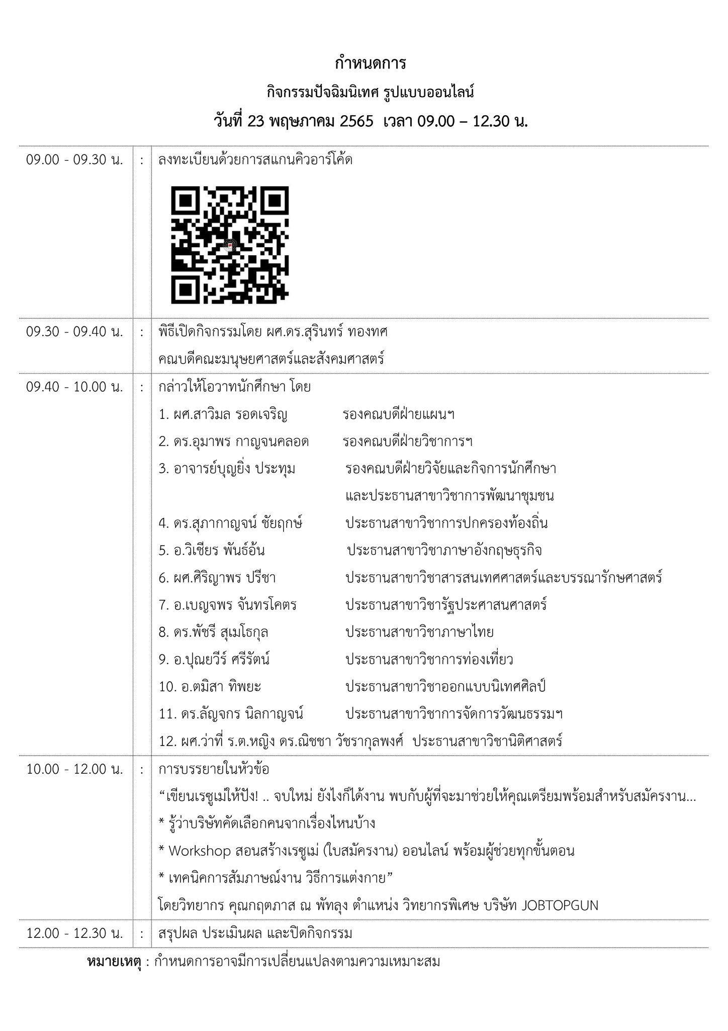 ขอเชิญนักศึกษาชั้นปีที่ 4 ที่สำเร็จการศึกษาในปีการศึกษา 2564 เข้าร่วมโครงการพัฒนานักศึกษาให้มีคุณลักษณะตามอัตลักษณ์บัณฑิต 4 ประการ (โครงการที่ 14) กิจกรรมปัจฉิมนิเทศ รูปแบบออนไลน์และการบรรยายในหัวข้อ “เขียนเรซูเม่ให้ปัง! .. จบใหม่ยังไงก็ได้งาน”