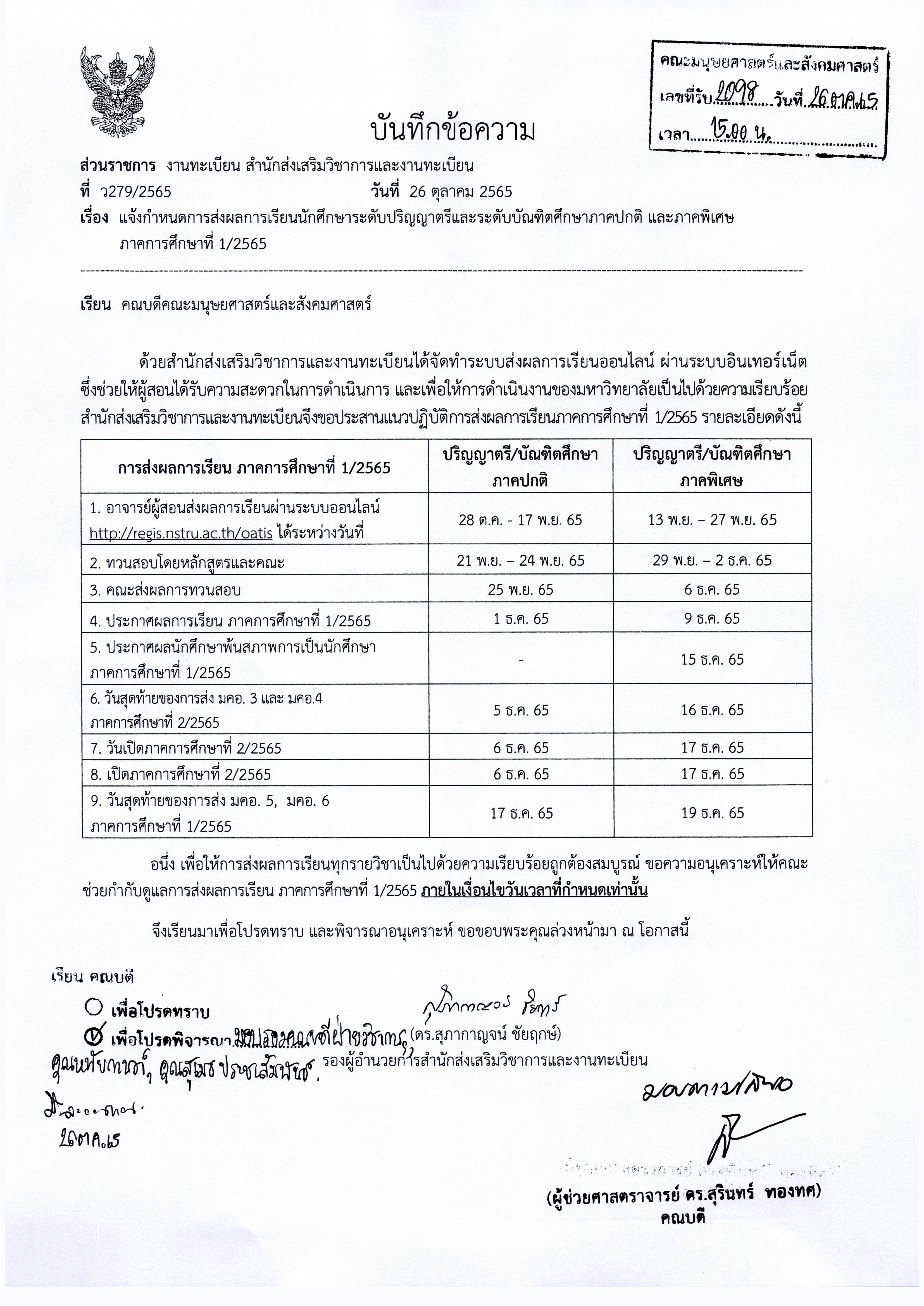 แจ้งกำหนดการส่งผลการเรียนนักศึการะดับปริญญาตรีและระดับบัณฑิตศึกษาภาคปกติ และภาคพิเศษ
