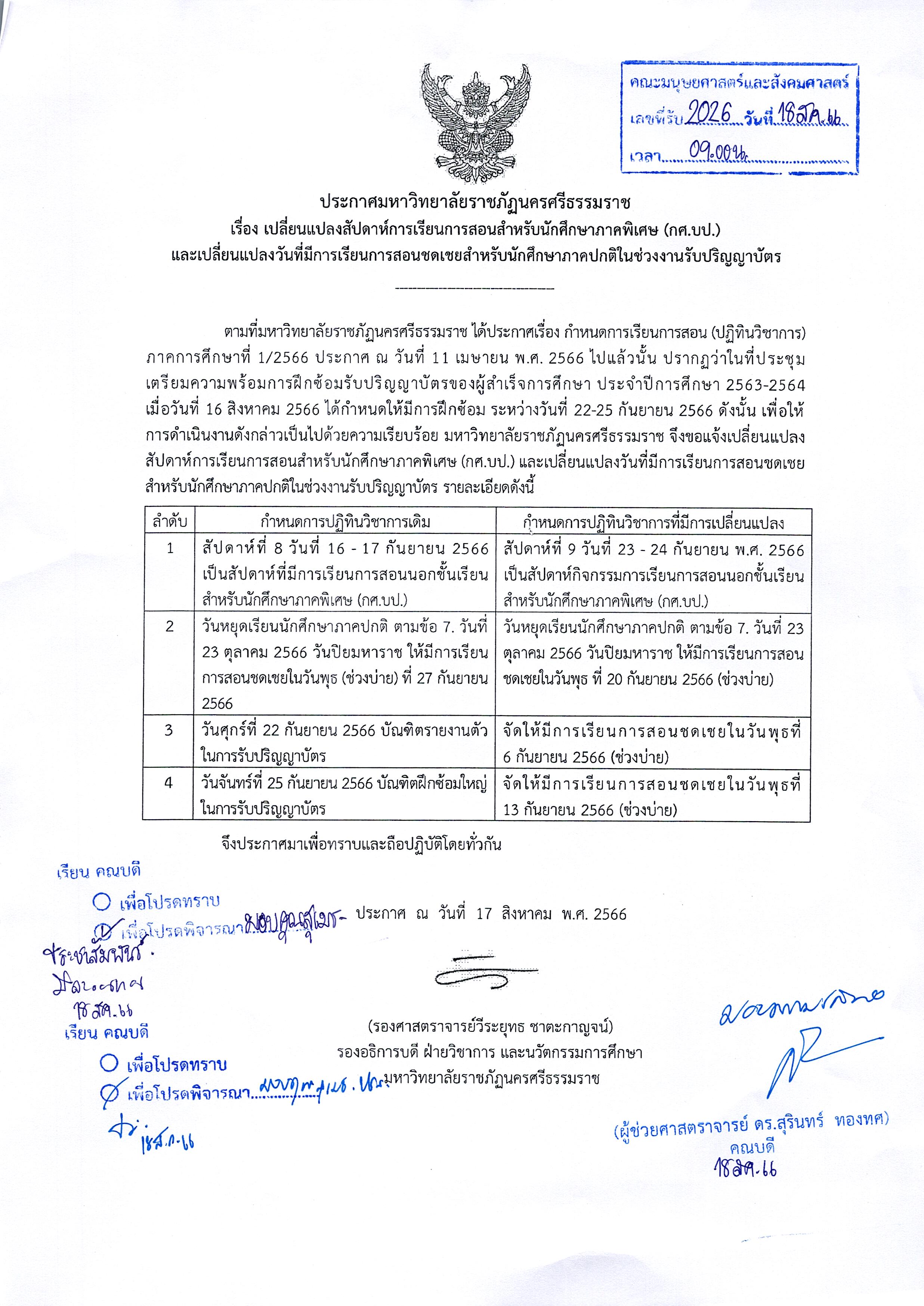 ประกาศมหาวิทยาลัยราชภัฏนครศรีธรรมราช เรื่อง เปลี่ยนแปลงสัปดาห์การเรียนการสอนสำหรับนักศึกษาภาคพิเศษ และการเปลี่ยนแปลงวันที่มีการเรียนการสอนชดเชยสำหรับภาคปกติ