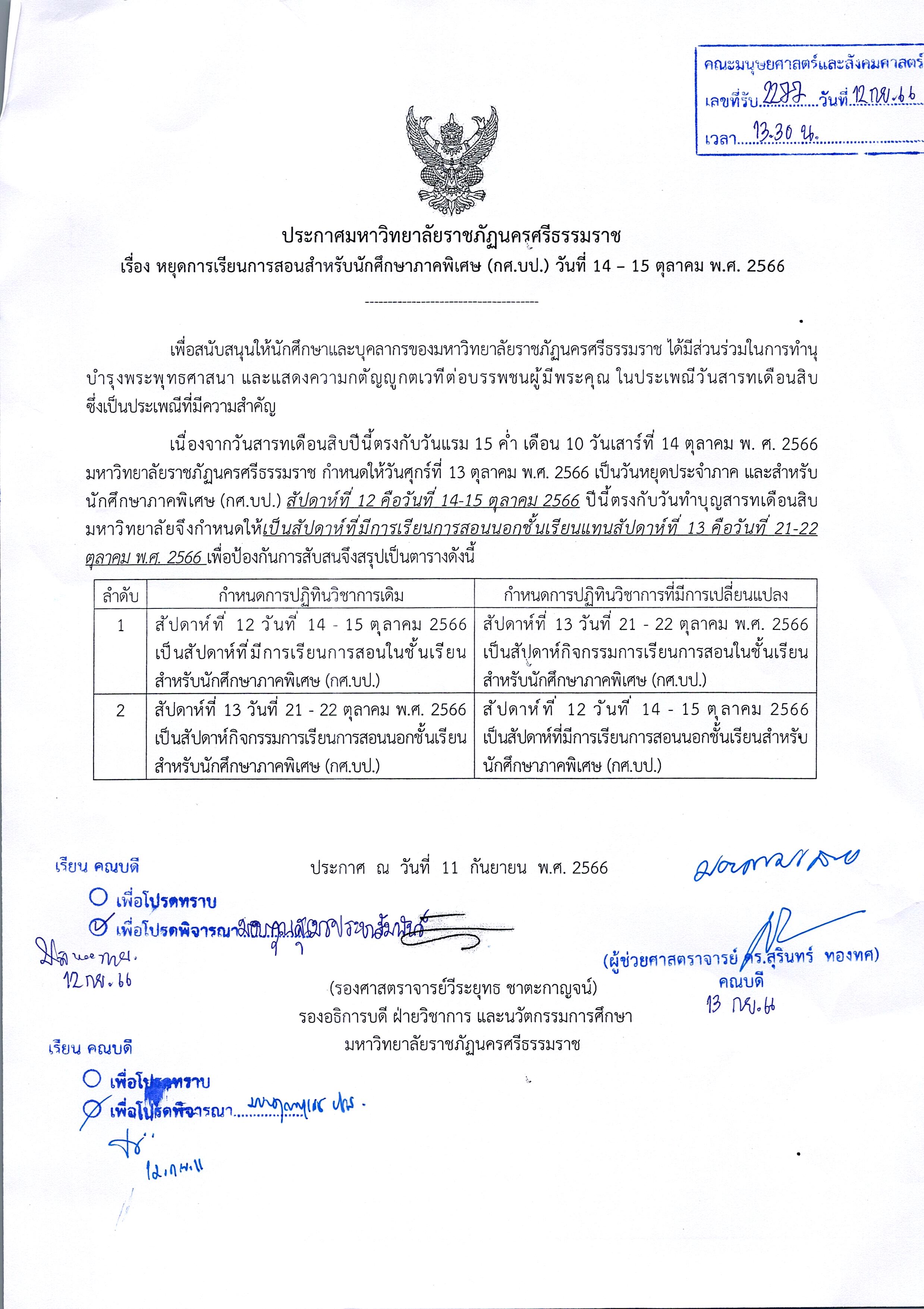 ประกาศมหาวิทยาลัยราชภัฏนครศรีธรรมราช เรื่องหยุดการเรียนการสอนสำหรับนักศึกษาภาคพิเศษ
