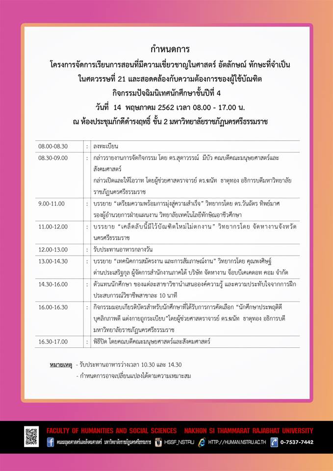 ประชาสัมพันธ์กิจกรรมปัจฉิมนิเทศนักศึกษา ชั้นปีที่ 4 คณะมนุษยศาสตร์และสังคมศาสตร์ มหาวิทยาลัยราชภัฏนครศรีธรรมราช วันที่ 14 พฤษภาคม 2562 เวลา 08:00-17:00 น. ณ หอประชุมภักดีดำรงค์ฤทธิ์ ชั้น 2 มหาวิทยาลัยราชภัฏนครศรีธรรมราช
