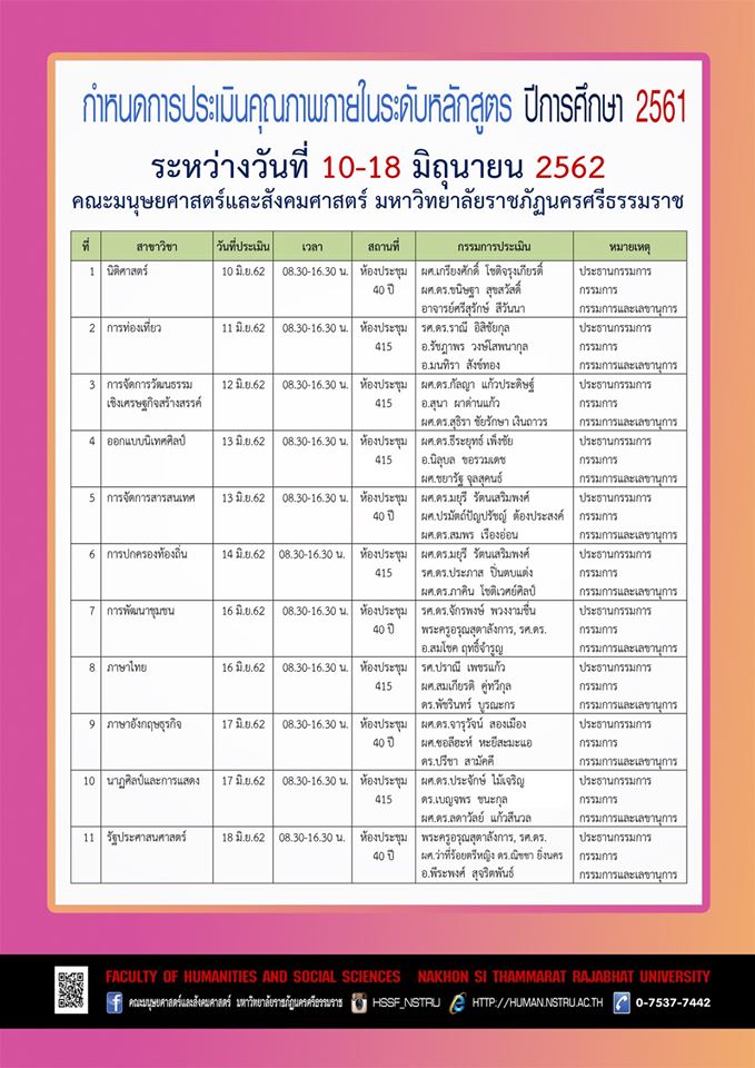 ประชาสัมพันธ์ กำหนดการประเมินคุณภาพภายในระดับหลักสูตร ปีการศึกษา 2561 ระหว่างวันที่ 10-18 มิถุนายน 2562 คณะมนุษยศาสตร์และสังคมศาสตร์ มหาวิทยาลัยราชภัฏนครศรีธรรมราช