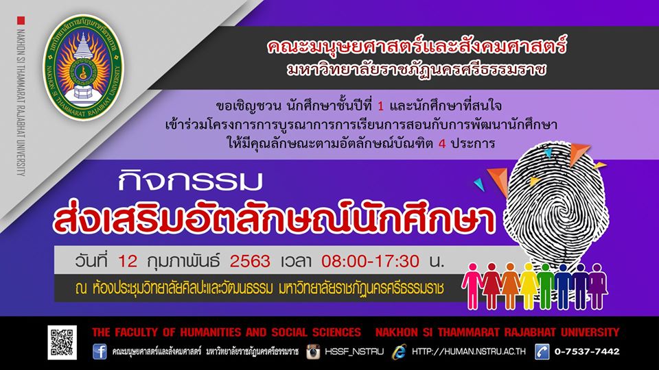 ขอเชิญชวน นักศึกษาชั้นปีที่ 1 และนักศึกษาที่สนใจ เข้าร่วมโครงการการบูรณาการการเรียนการสอนกับการพัฒนานักศึกษาให้มีคุณลักษณะตามอัตลักษณ์บัณฑิต 4 ประการ กับกิจกรรมส่งเสริมอัตลักษณ์นักศึกษา วันที่ 12 กุมภาพันธ์ 2563 เวลา 08.00 - 17.30 น. ณ ห้องประชุมวิทยาลัยศ