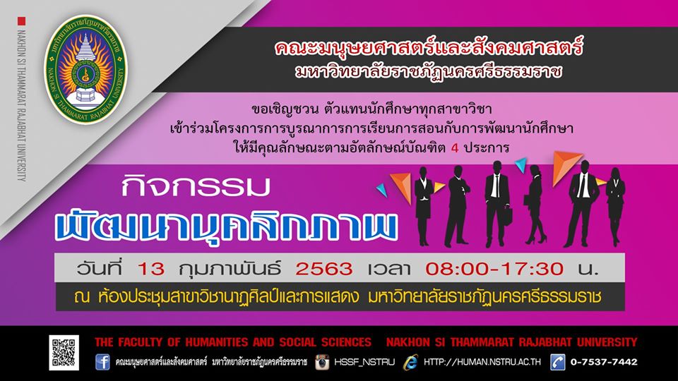 ขอเชิญชวน ตัวแทนนักศึกษาทุกสาขาวิชา เข้าร่วมโครงการการบูรณาการการเรียนการสอนกับการพัฒนานักศึกษาให้มีคุณลักษณะตามอัตลักษณ์บัณฑิต 4 ประการ กับกิจกรรมพัฒนาบุคลิกภาพ วันที่ 13 กุมภาพันธ์ 2563 เวลา 08.00 - 17.30 น. ณ ห้องประชุมสาขาวิชานาฏศิลป์และการแสดง มหาวิท