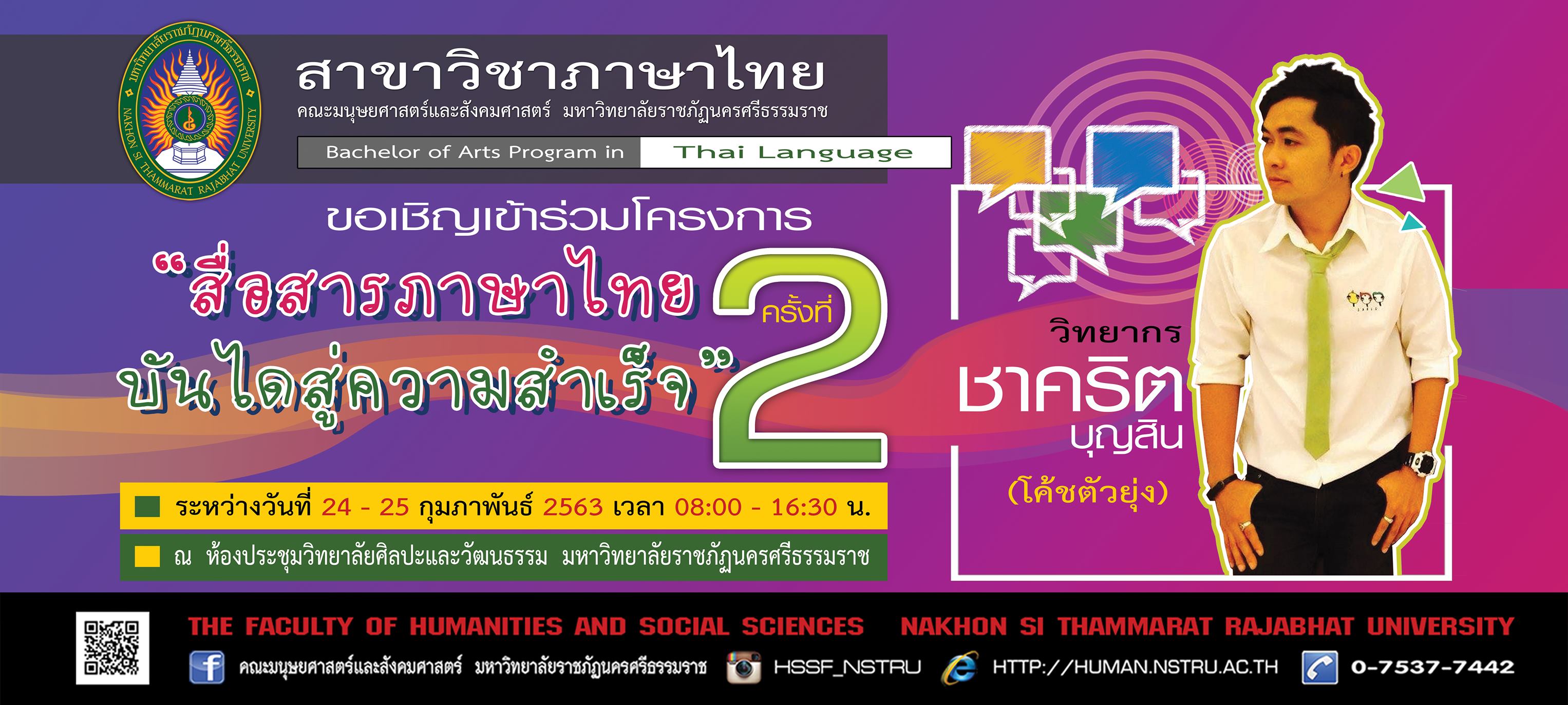 สาขาวิชาภาษาไทย คณะมนุษยศาสตร์และสังคมศาสตร์ มหาวิทยาลัยราชภัฏนครศรีธรรมราช ขอเชิญนักศึกษาและผู่ที่สนใจเข้าร่วมโครงการ "สื่อสารภาษาไทย บันไดสู่ความสำเร็จ ครั้งที่ 2" วิทยากรโดย.. ชาคริต บุญสิน (โค้ชตัวยุ่ง) ระหว่างวันที 24-25 กุมภาพันธ์ 2563 เวลา 08.00 -