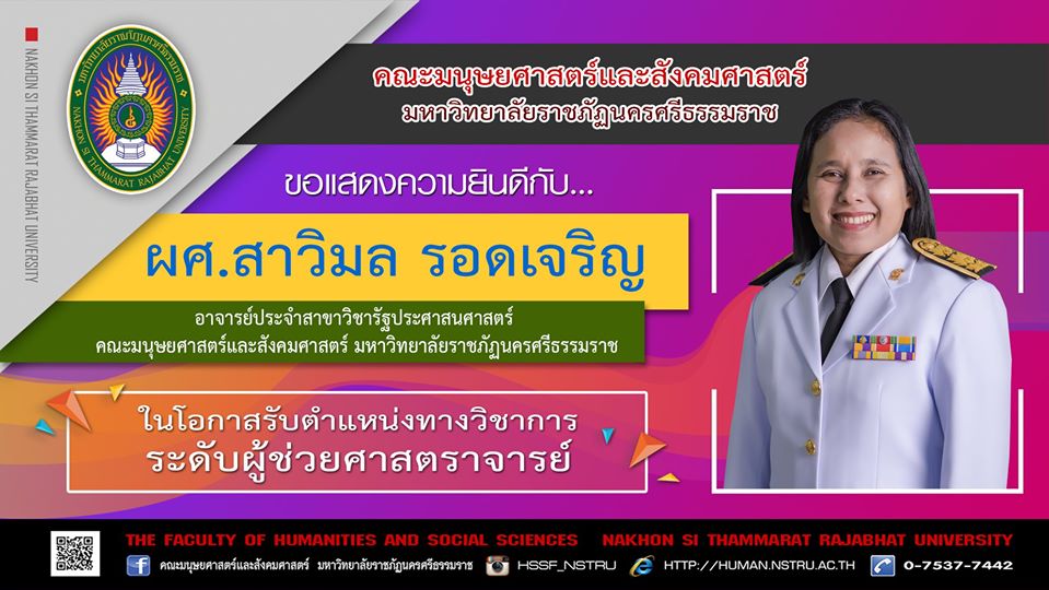 ขอแสดงความยินดีกับ... "ผู้ช่วยศาสตราจารย์สาวิมล รอดเจริญ" อาจารย์ประจำสาขาวิชารัฐประศาสนศาสตร์ คณะมนุษยศาสตร์และสังคมศาสตร์ มหาวิทยาลัยราชภัฏนครศรีธรรมราช เนื่องในโอกาสรับตำแหน่งทางวิชาการระดับ "ผู้ช่วยศาสตราจารย์"